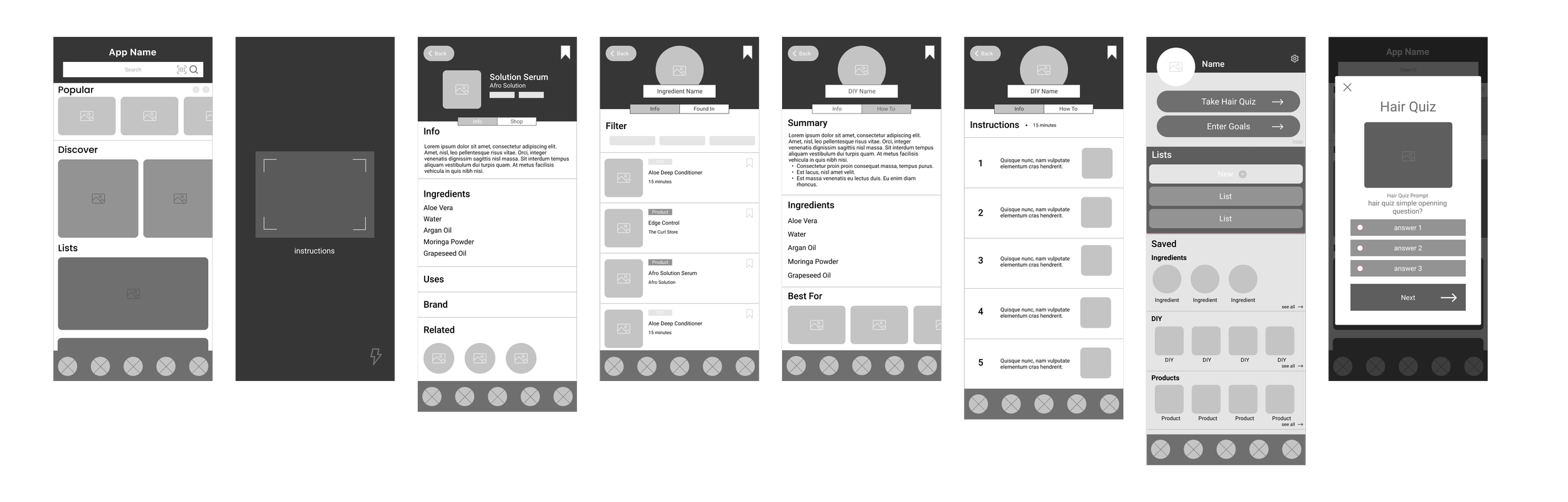 These low-fidelity wireframes were used to map the product as a learning system rather than a collection of features. The focus was on exploring and narrowing down potential entry points (scan, ingredient profile, quizzes), defining how knowledge moves between surfaces, and reducing decision friction before introducing visual design.
