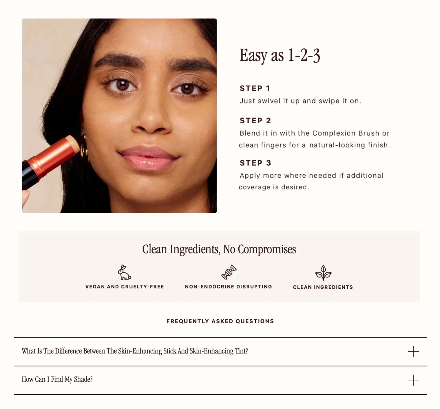 Instructional content featuring model wearing the product while visibly holding the product in-hand